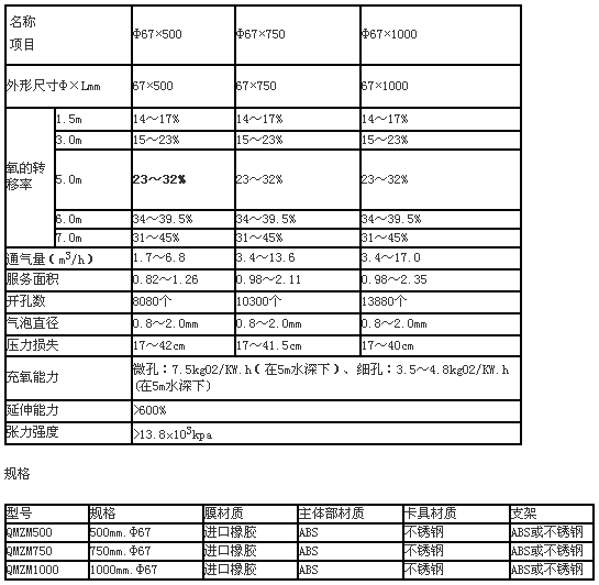 微孔曝气管的气体扩散胶管是原装进口材料,理化性能稳定,寿命长:均匀打孔,孔径均匀细小,扩展出来的气泡直径小,气液界面面积大,因此,具有较高的传质速率,充氧效率高,这样与其它现行曝气装置相比,可以大大节省电耗,降低污水处理的运行成本。由于微孔曝气器扩散胶采用进口优质橡胶制成的,它具有优良的物理,机械性能;配件及空气管道是采用ABS工程塑料组合的,因此,不怕锈蚀,性能可靠,在很大程度上减少了运行维修工作量。