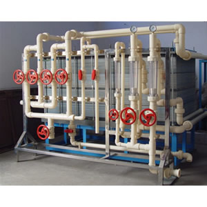 该设备由电离子交换膜、隔板、极板和夹具等组成。离子交换膜分阴膜、阳膜和复合膜三类。按结构分为均相膜,半均相膜、异相膜三种。水处理用的电渗析器常采用异相膜。隔板材料常采用聚氯乙烯和聚丙烯,其类型有填网式和冲膜式。电极材料有石墨电极,不锈钢电极、钛涂钌电极、钛镀铂电极及铅电极等,最常用的为厂钌电极和钛涂钌电极。