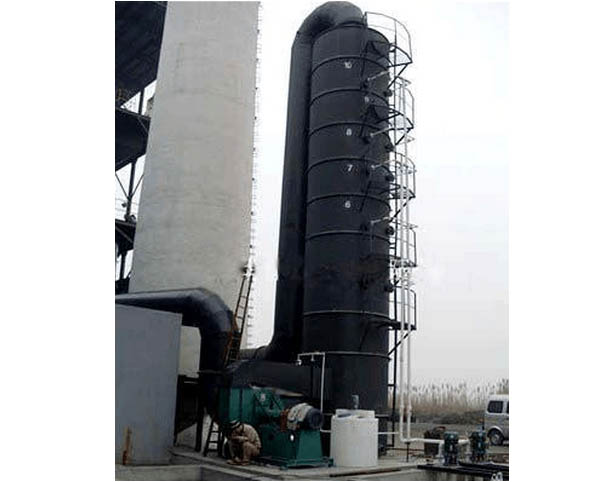 在烟道入口处设计初级喷淋装置,当烟气经进口烟道,与布置在进口烟道段的喷淋形成的水雾进行传质换热,得到初步降温和去除部分二氧化硫,切向进入吸收塔。烟气在吸收塔内通过旋流气动装置的加速和旋流,烟尘与经过雾化的吸收液发生碰撞、附着、凝聚、离心分离等综合性的作用,被甩到塔壁,随塔壁水膜流向塔底。旋流板喷淋塔脱硫除尘效率可以达到90%以上。通过旋流气动装置的设置,使烟气在同样高度的筒体内旋转次数增加、通过的路径增长,气相紊动剧烈,烟气与吸收液在时间和空间上得到充分的碰撞、接触、溶解、吸收。