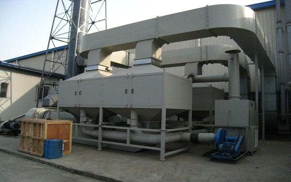 2. 经过过滤后的废气,进入后续设备的吸附床,吸附净化的洁净气体排放烟囱,吸附在蜂窝活性炭/活性炭纤维/沸石等载体上的有机物,利用高温气体(100~120℃)对其进行脱附。高温气体来源为后方CO燃烧后的高温空气与自然风混合生成。